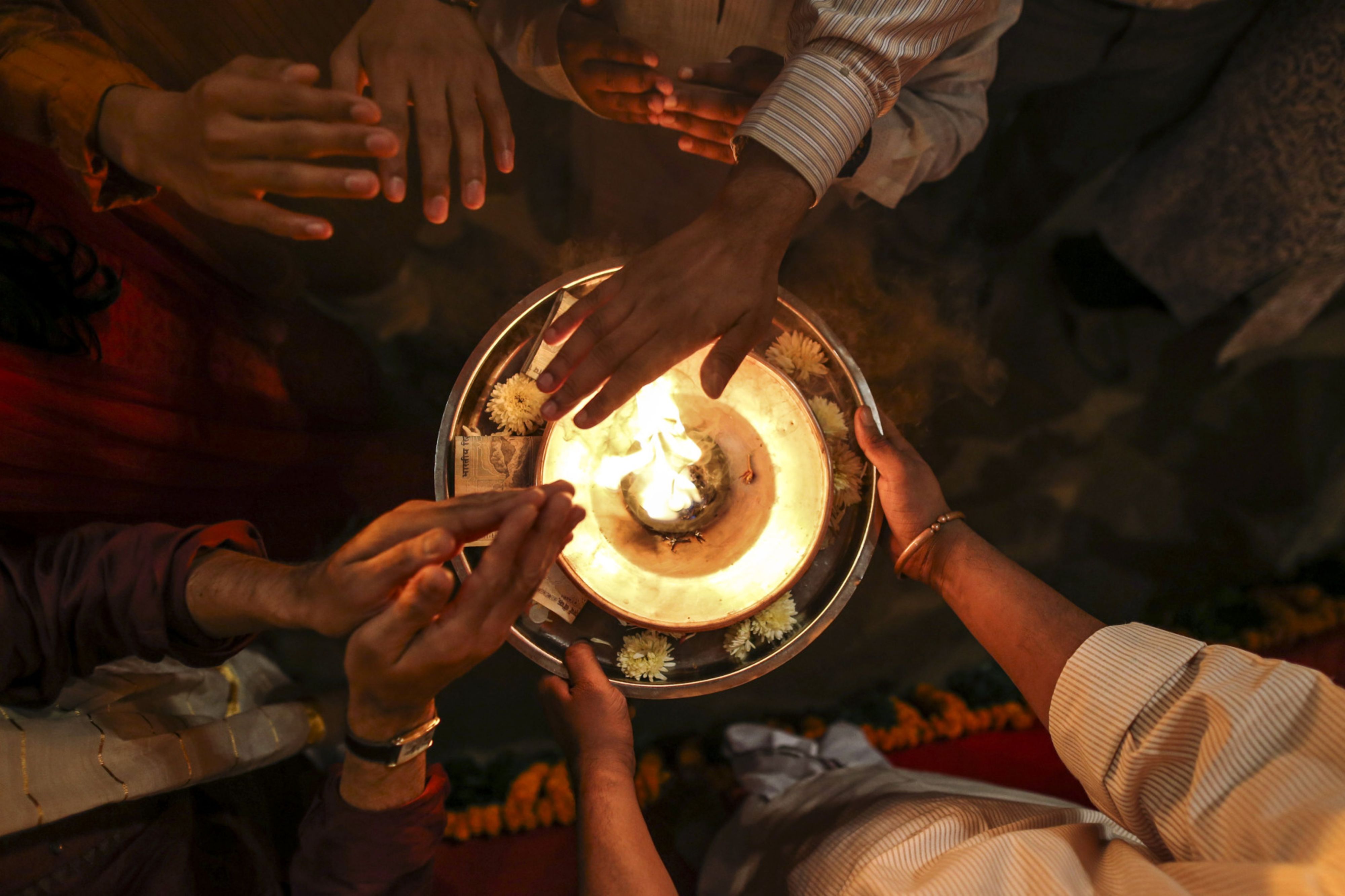 A file photograph of brokers praying before ceremonial purchases of stocks are made during the session marking Diwali at the Bombay Stock Exchange in Mumbai. (Photographer: Dhiraj Singh/Bloomberg)