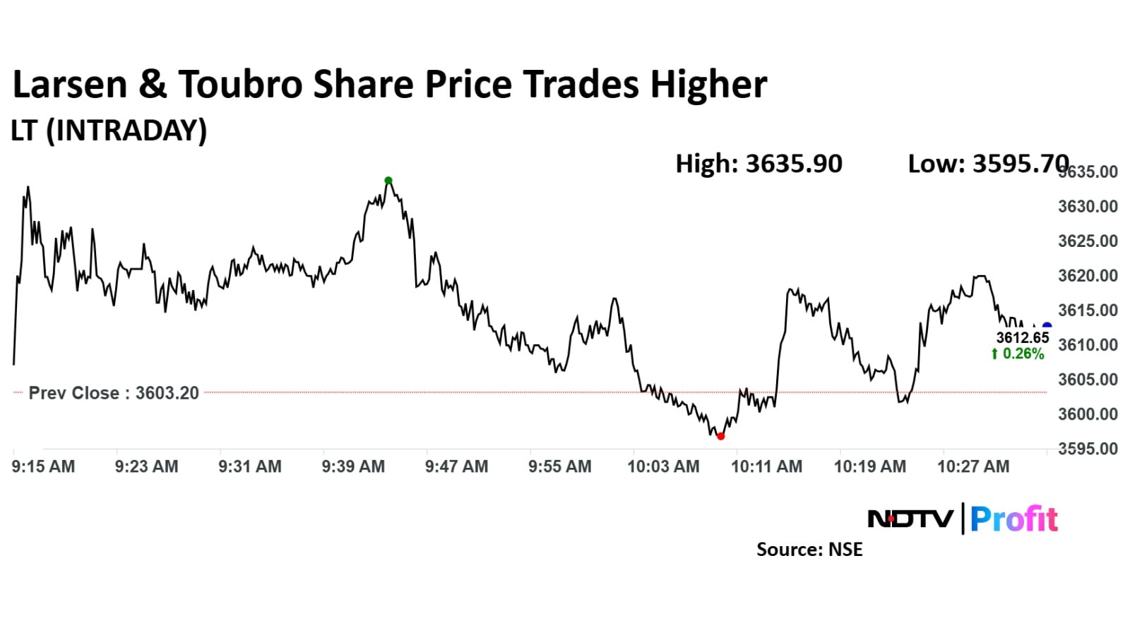 Share price of L&T rose as much as 0.91% to Rs 3,635.90 apiece. They pared gains to trade 0.24% higher at Rs 3,612 apiece, as of 10:56 a.m., compared to a 0.44% advance in the NSE Nifty 50.