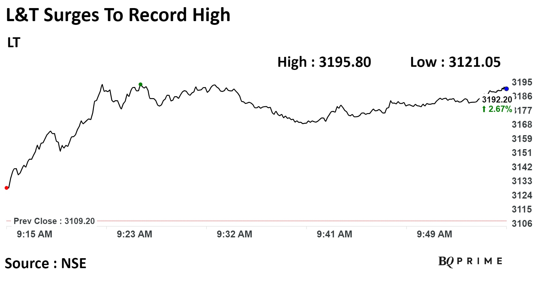 L&T's stock rose as much as 2.79% during the day to Rs 3,195.80 apiece on the NSE. It was trading 2.35% higher at Rs 3,182.20 apiece, compared to a 0.53% advance in the benchmark Nifty 50 as of 09:52 a.m.