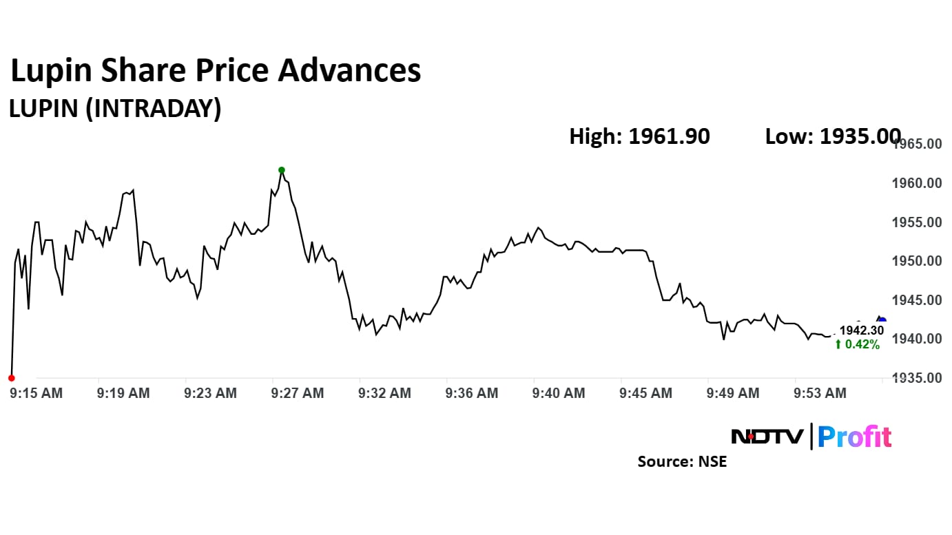 Shares of Lupin rose as much as 1.43% to Rs 1,961.90 apiece. It pared gains to trade 0.56% higher at Rs 1,945 apiece, as of 09:52 a.m. This compares to a 0.06% decline in the NSE Nifty 50.