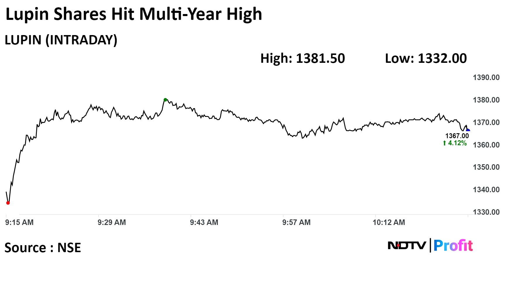 Shares of Lupin rose 5.23% intraday, the highest since April 26, 2017. They pared gains to trade 4.10% higher at 10:28 a.m., compared to a 0.6% decline in the NSE Nifty 50.