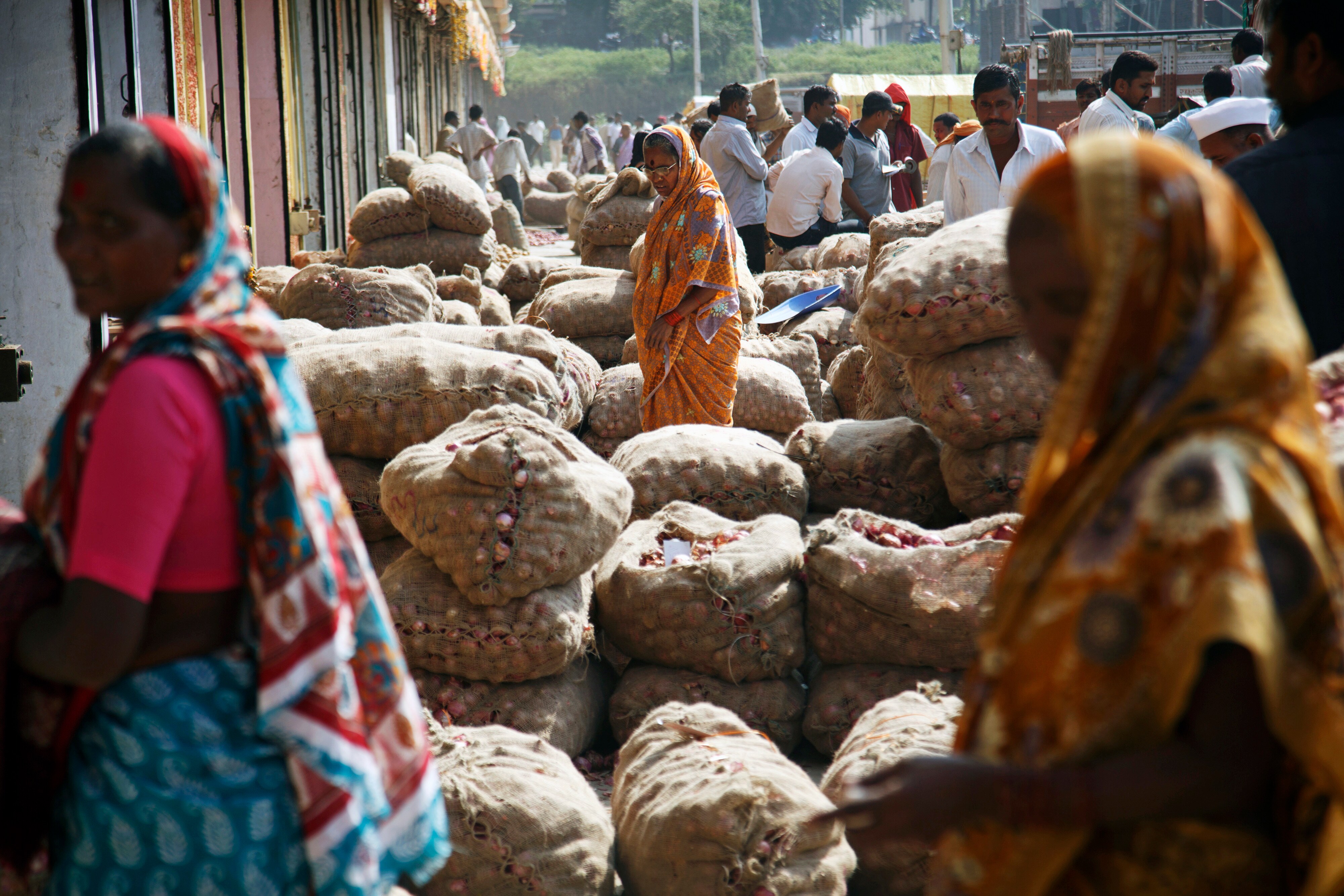 Customers browse bags of onions displayed for sale at a wholesale market in Nashik, Maharashtra, India. This is a file photo. (Photographer: Kuni Takahashi/Bloomberg)