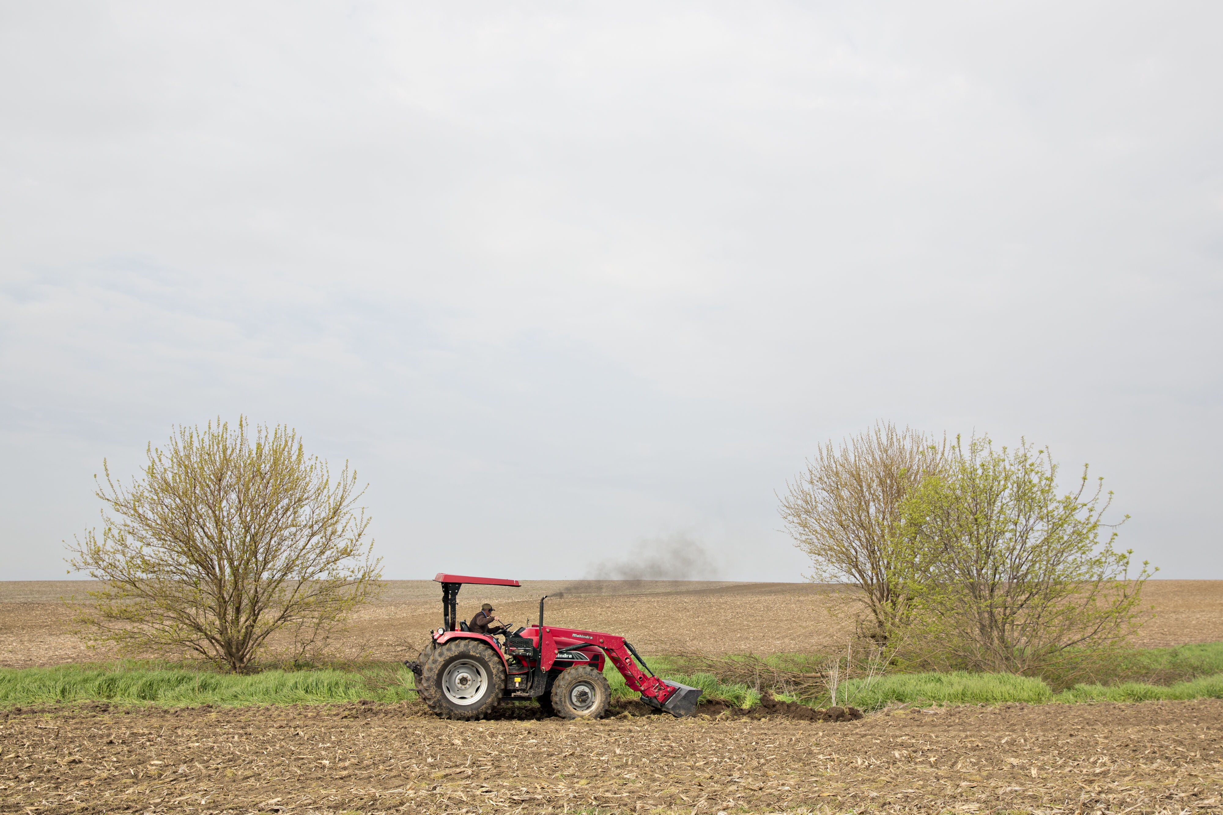 A farmer uses a Mahindra & Mahindra Ltd. tractor to fill an area at the edge of his corn field. (Photographer: Daniel Acker/Bloomberg)