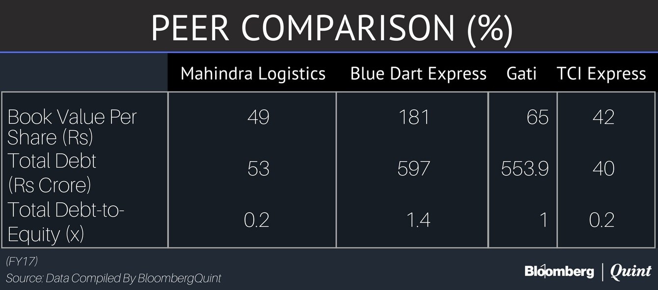 - Mahindra Logistics' net worth stood at Rs 363 crore for the quarter ended June, translating into a book value of Rs 51 a share.