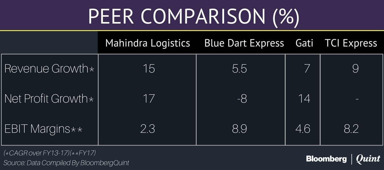 Compared to peers like Blue Dart Express Ltd., Gati Ltd. and TCI Express Ltd., Mahindra Logistics has been growing at a faster pace but lease costs have hurt margins.