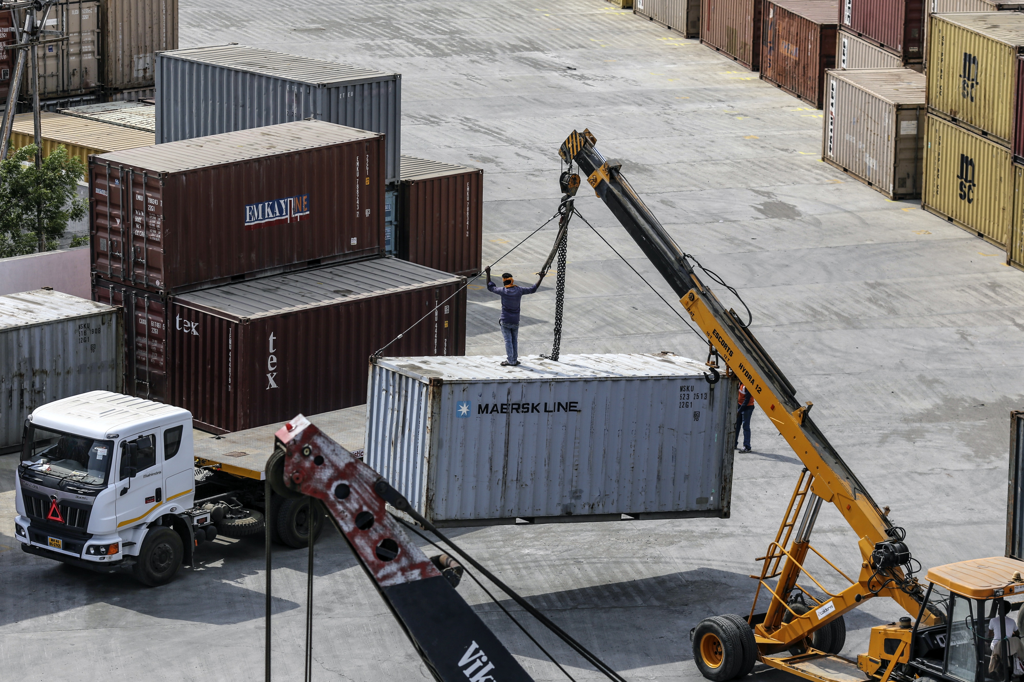 A worker stands on top of a shipping container as it is lifted by a crane at an integrated logistics park. (Photographer: Dhiraj Singh/Bloomberg)
