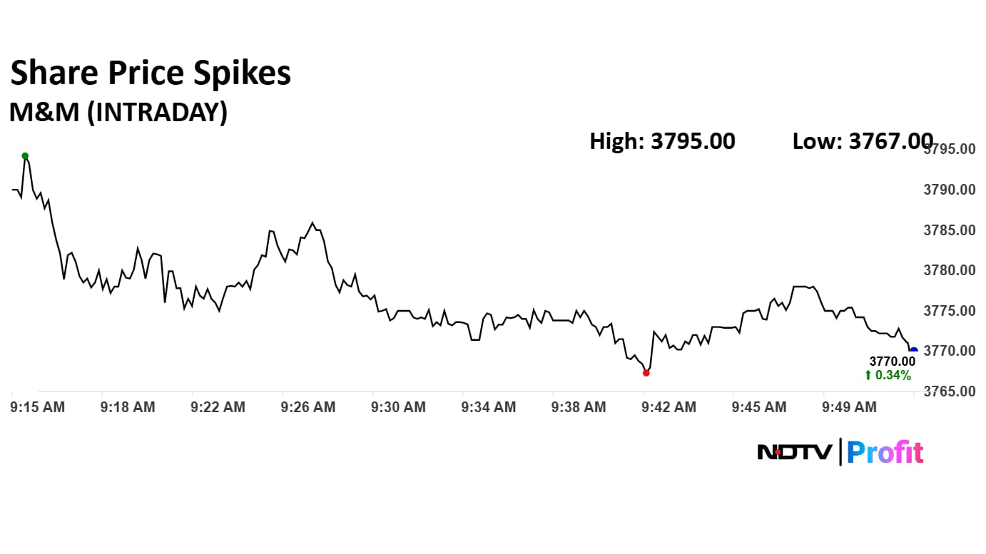 Mahindra and Mahindra Ltd.'s share price spikes 1% to reach an all time high at Rs 3,795 apiece on Monday. The stock has been on a steady upward trend for over a month, gaining more than 6% in the past 30 days.