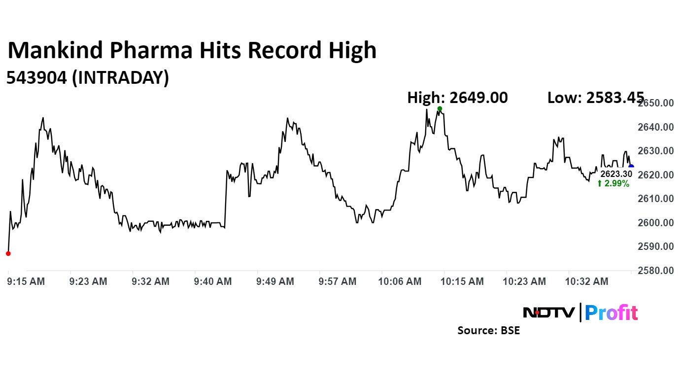 Mankind Pharma Ltd. shares rose as much as 4.43%, the highest level since its listing on May 9, 2023, before paring gains to trade 3.55% higher at Rs 2,625.85 per share as of 10:41 a.m. This compared to a 0.30% advance in the NSE Nifty 50.