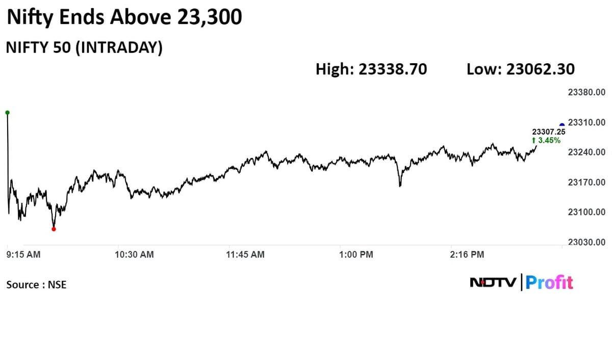 On Monday, the NSE Nifty 50 gained 733.20 points, or 3.25%, to close at 23,263.90, and the S&P BSE Sensex rose 2,507.47 points, or 3.39%, to end at 76,468.70. Both the indices renewed their intraday highs of 23,338.70 and 76,738.89, respectively.