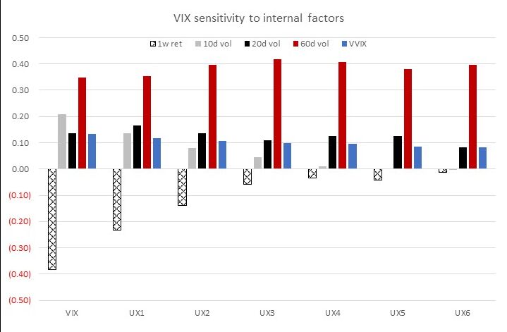 The past couple of days have seen their fair share of volatility, and short-term options — which are more sensitive to such moves than the longer-dated contracts — were quick to react. Data compiled by Citigroup Inc.'s Stuart Kaiser illustrates just how more sensitive the VIX Index is to short-term moves in the S&P 500 Index and the S&P 500's realized price swings than the volatility curve further out in time.