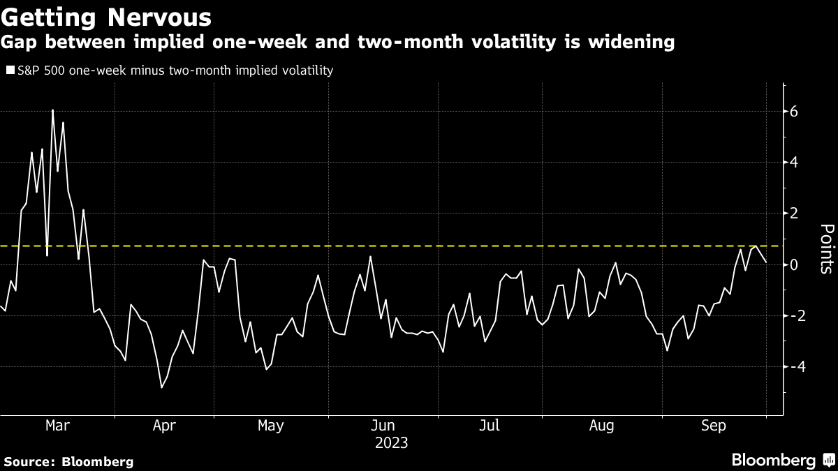 It's easy to see why traders would be nervous heading into this week with the specter of the narrowly-averted US government shutdown hovering over their heads. In addition, the yield on the 10-year Treasury note is hanging around its highest level in almost 16 years, sapping the appeal of riskier assets. Then there's the question of how far the Federal Reserve is willing to go to combat inflation. And a worsening auto-worker strike only adds to the risk of wider price swings ahead.