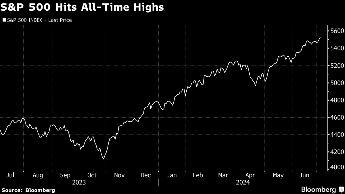 The S&P 500 topped 5,535, notching its 33rd record in 2024. Tesla Inc. extended its rally into a seventh straight session, leading gains in megacaps — though Amazon.com Inc. fell. Treasury 10-year yields dropped seven basis points to 4.36%. The dollar slipped.