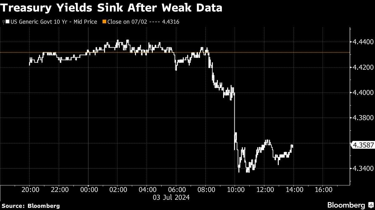 (Bloomberg) -- Wall Street traders sent stocks higher as bonds yields fell after a string of weaker-than-estimated economic reports reinforced the case for the Federal Reserve to start cutting rates this year.