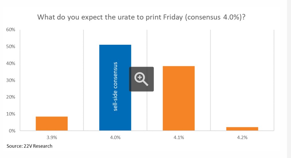 A survey conducted by 22V Research shows that 40% of investors think the market reaction to Friday's employment data will be “negligible/mixed,” 34% said “risk-on” and 26% “risk-off.”