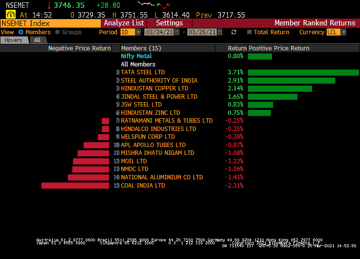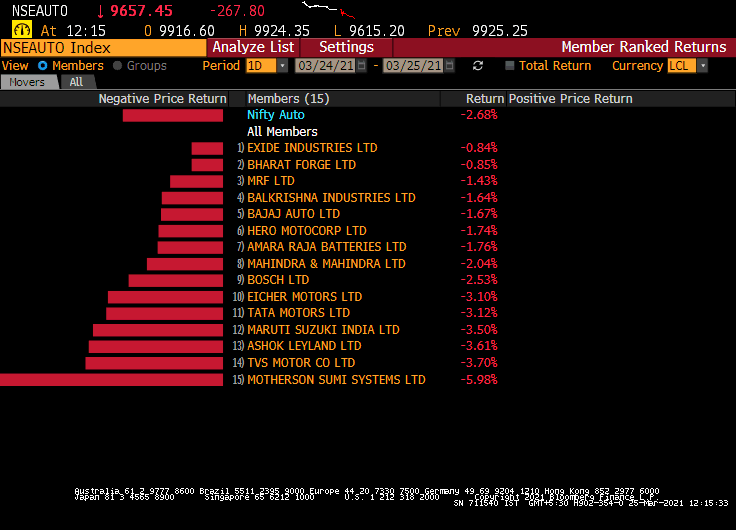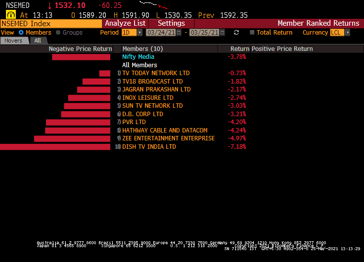 The S&P BSE Sensex ended 1.5% lower at 48,440 while the NSE Nifty 50 too fell 1.5% to end at 14,324. 45 out of the 50 index constituents ended with losses. The top contributor to the downside was Reliance Industries which fell over 2.5% and was down for the second day in a row.
