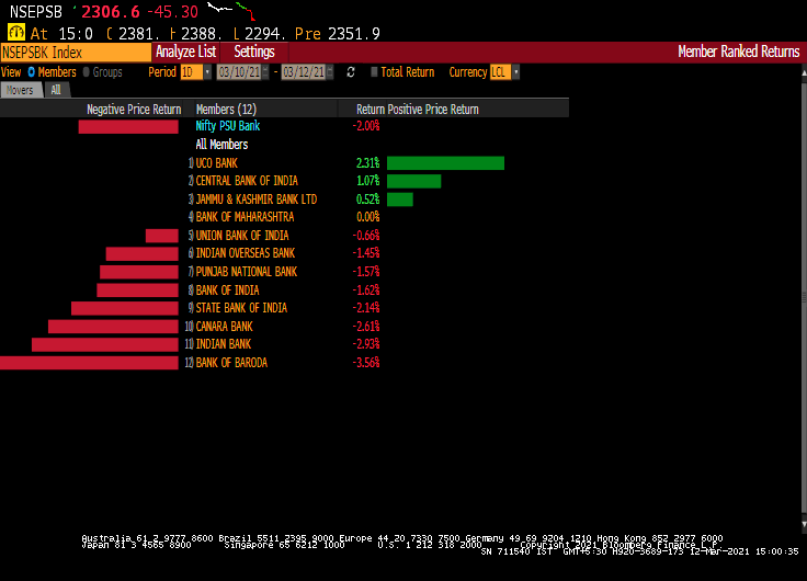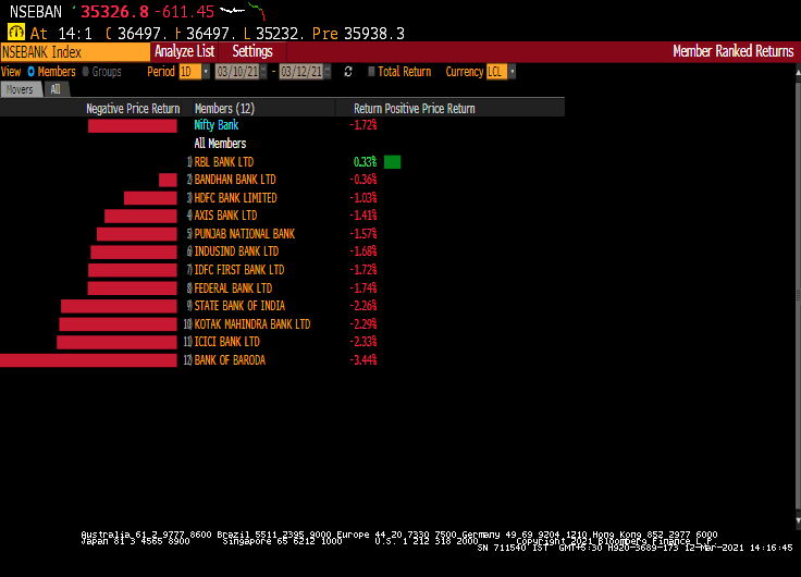 All sectoral indices ended lower in today's session. The Nifty Bank index declined 1,000 points from the day's high to end 1.2% lower at 35,496. The PSU Bank index too ended 1.7% lower in today's session.