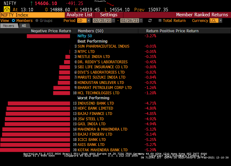 The S&P BSE Sensex ended 3.8% or 1,939 points lower at 49,099 while the NSE Nifty 50 index also shed over 550 points to end 3.8% lower at 14,529. This was the worst weekly drop for the Sensex and the Nifty in a month, when equities had declined over 5% ahead of the Union Budget. All 50 constituents on the Nifty index ended with losses in today's session.
