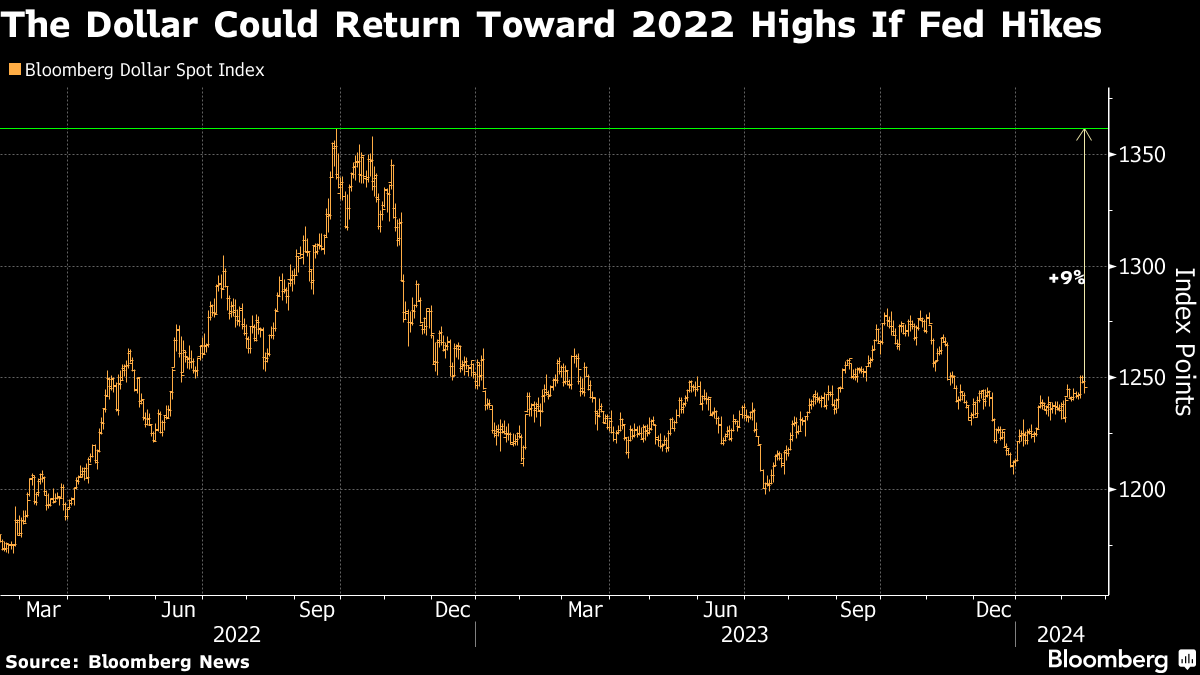 At Societe Generale SA, Chief FX Strategist Kit Juckes told clients in a report last week that if “the US economy re-accelerates, the Fed will eventually have to tighten again and the dollar will rally,” possibly back to 2022's all-time high.
