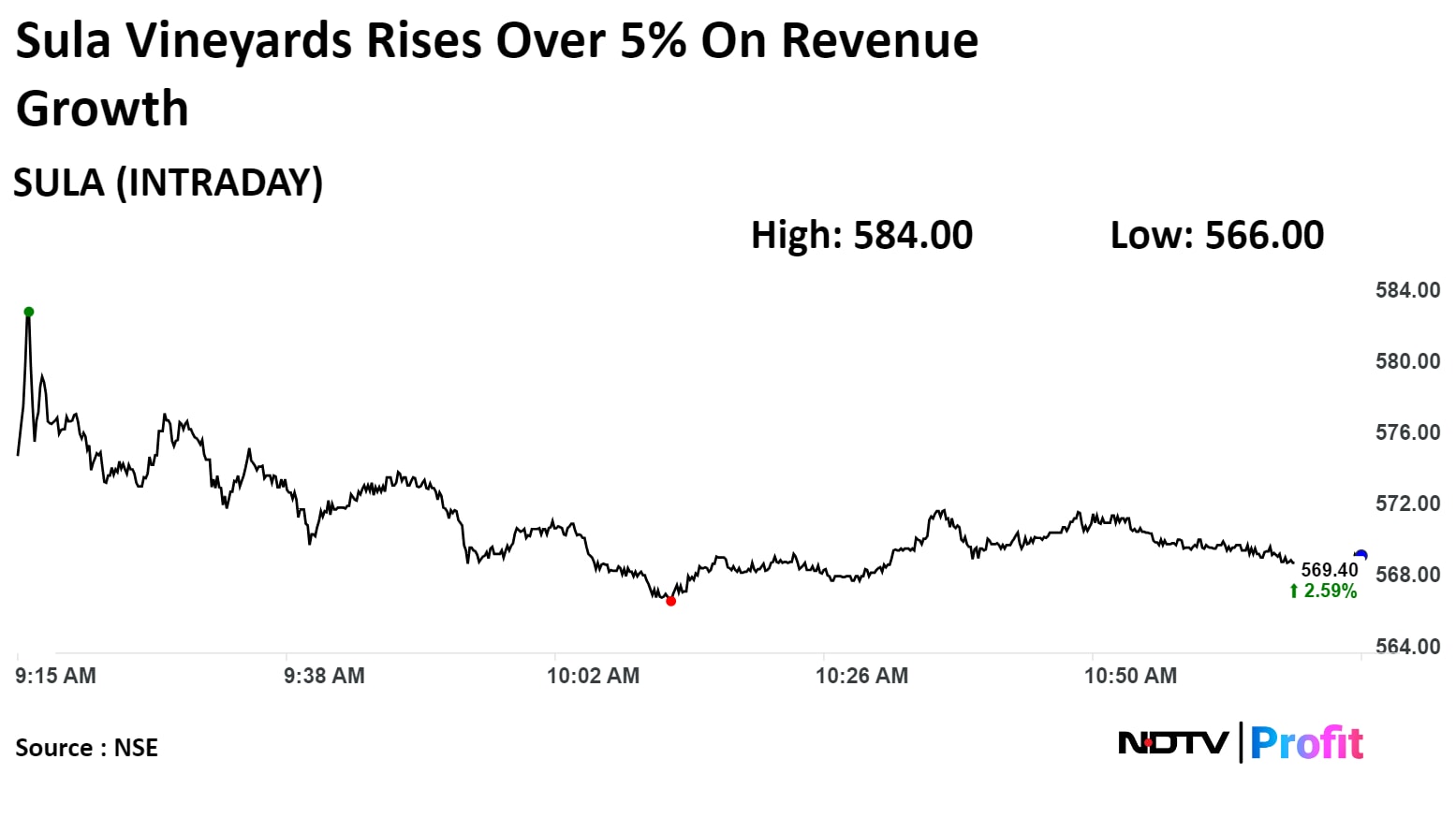 Shares of Sula Vineyards Ltd. gained over 5% on Tuesday after it reported its highest-ever revenue growth in the fourth quarter, led by sales of its premium own brand and wine tourism.