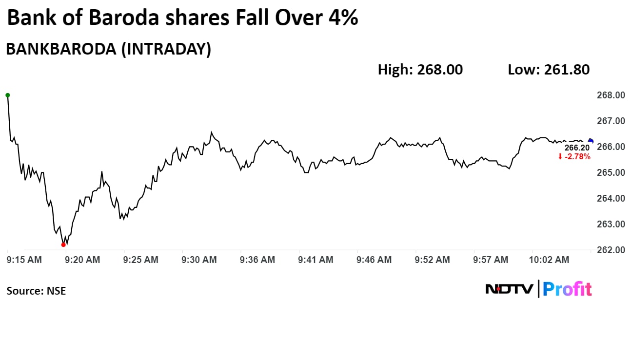 On the NSE, Bank of Baroda's stock fell as much as 4.3% in early trade to Rs 261.8 apiece, lowest since June 4. It was trading 2.79% lower at Rs 266.15 apiece, compared to a 0.08% decline in the benchmark Nifty 50 at 10:05 a.m.