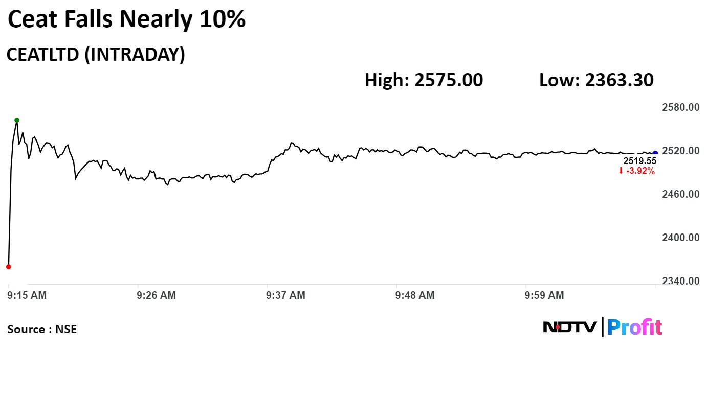 Shares of Ceat Ltd. plunged nearly 10% on Friday to the lowest in over four months after its consolidated net profit fell 23% in the fourth quarter of financial year 2024, missing analysts' estimates.