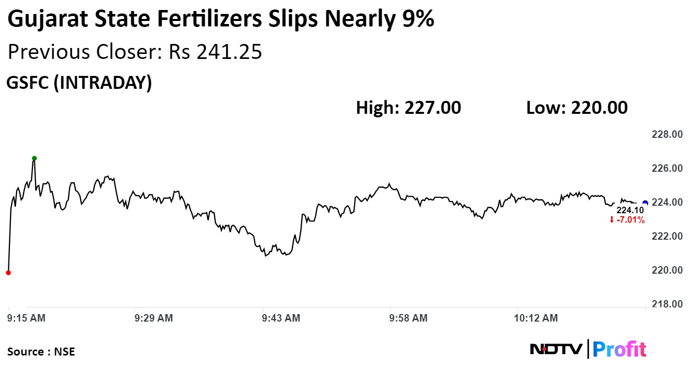 On the NSE, GSFC's stock fell as much as 8.81% during the day to Rs 220 apiece, the lowest since May 13. It was trading 6.94% lower at Rs 224.55 per share, compared to a 0.10% advance in the benchmark Nifty at 10:21 a.m.