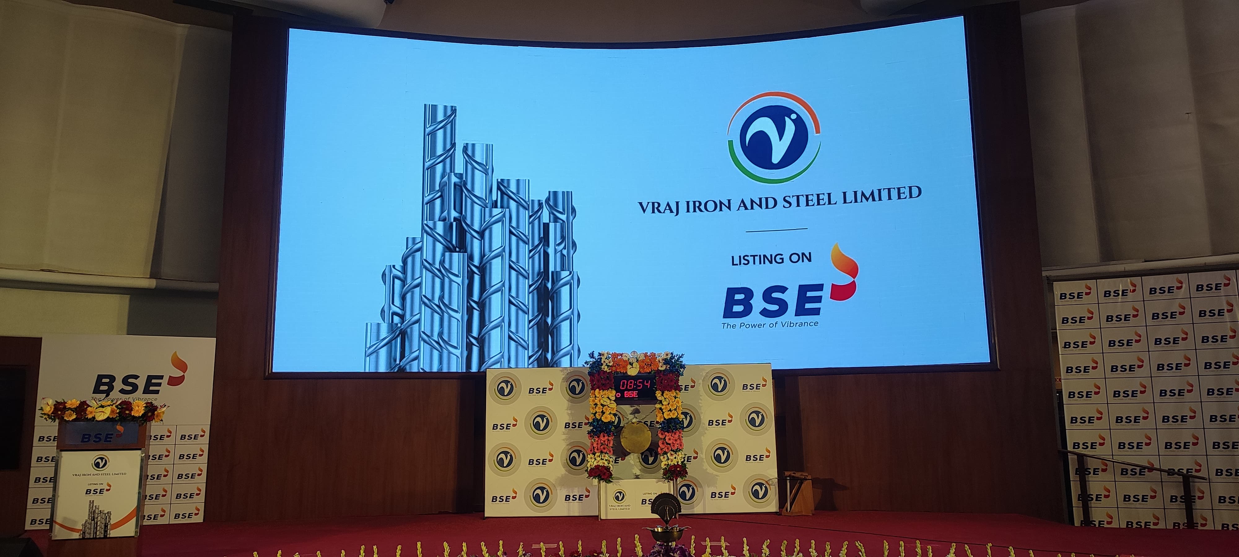 Shares of Vraj Iron & Steel Ltd. ended on the BSE on Wednesday at Rs 251.9 apiece, a premium of 21.6% over its issue price of Rs 207. On the National Stock Exchange, the stock closed at Rs 252 per share, a premium of 21.7%.