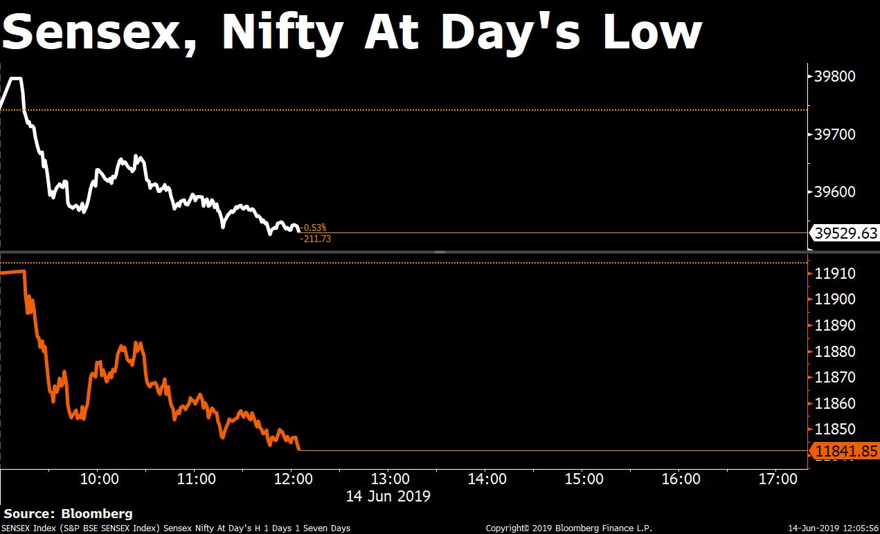 The S&P BSE Sensex traded 160 points or 0.4 percent lower at 39,575 as of 11 a.m. and the NSE Nifty 50 traded at 11,855.80, down 0.5 percent. The mid-cap index represented by the NSE Nifty MidCap 100 fell 0.4 percent lower.