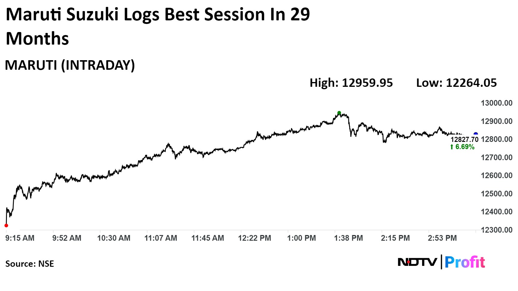Maruti Suzuki India Ltd. logged its best session in 29 months to end at a record high close in three weeks on Tuesday, after the Uttar Pradesh government announced a complete waiver of the registration fee on strong hybrid cars and plug-in hybrid cars.