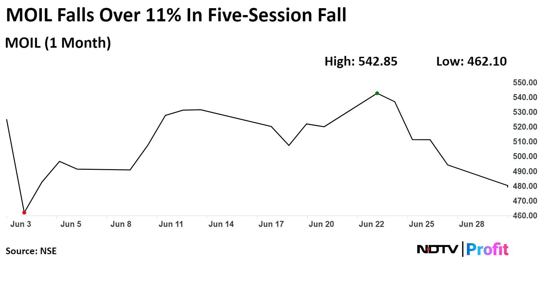 On the NSE, MOIL's stock fell as much as 4.3% during the day to Rs 473.10 apiece, the lowest since June 5. It was trading 1.84% lower at Rs 485.65, compared to a 0.27% advance in the benchmark Nifty at 9:42 a.m.