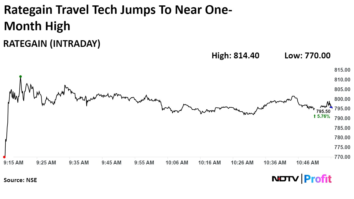 On the NSE, RateGain's stock rose as much as 8.28% during the day to Rs 814.40 apiece, the highest since May 21. It was trading 6.02% higher at Rs 797.40 apiece, compared to a 0.07% advance in the benchmark Nifty at 10:59 a.m.