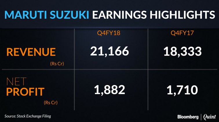 Net profit rose 10 percent year-on-year to Rs 1,882 crore for the quarter ended March due to the higher tax outgo and finance costs, Maruti said in its stock exchange notification. That compares with the Bloomberg consensus estimate of Rs 2,085 crore.
