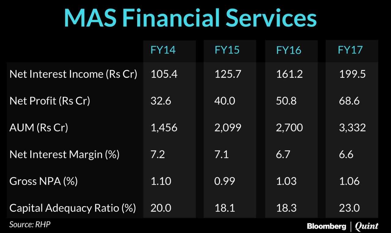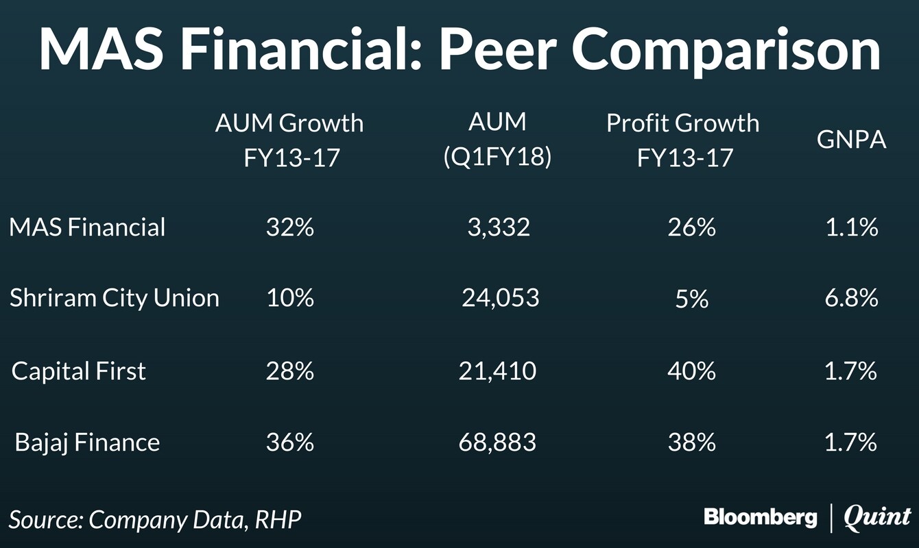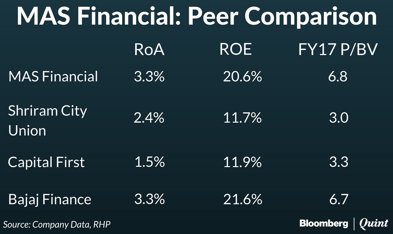 At the upper price band, MAS Financial is valued at 6.8 times its book value for the year to March and at 4 times its book value on a post-dilution basis. That's higher than peers such as Shriram City Union and Capital First and is comparable to that of Bajaj Finance.