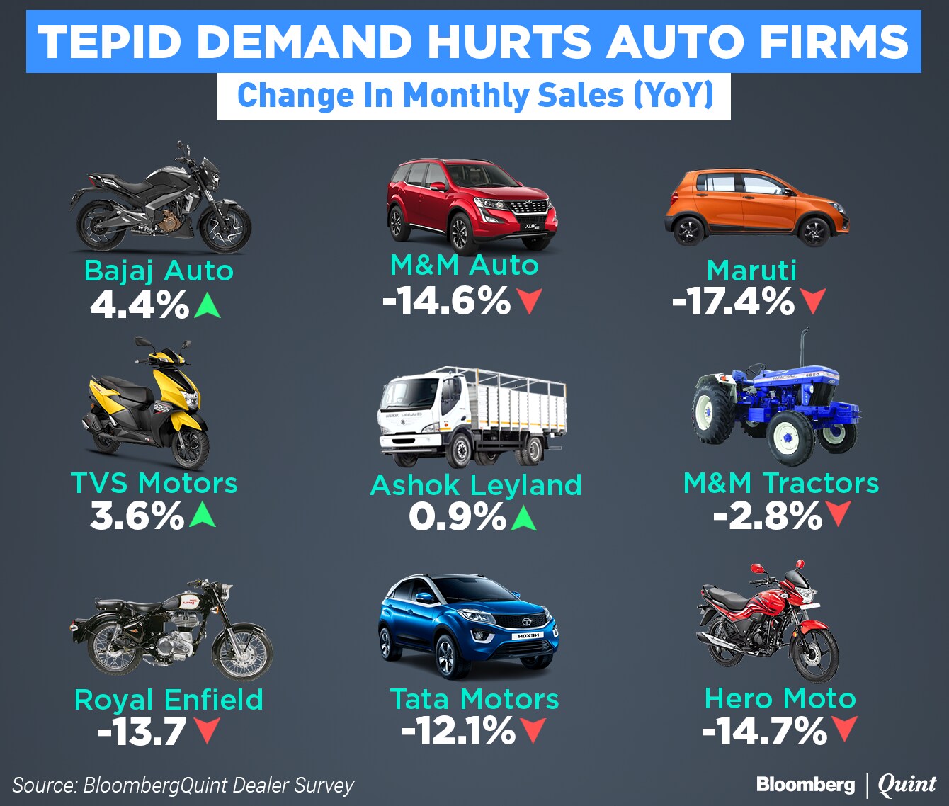 May Auto Sales Update | Catch live updates on how many units did Maruti Suzuki, Hero MotoCorp, Bajaj Auto, Tata Motors, Eicher Motors, Royal Enfield, Ashok Leyland, Escorts, Hyundai Motors and TVS Motor sold in May 2019 on BloombergQuint.