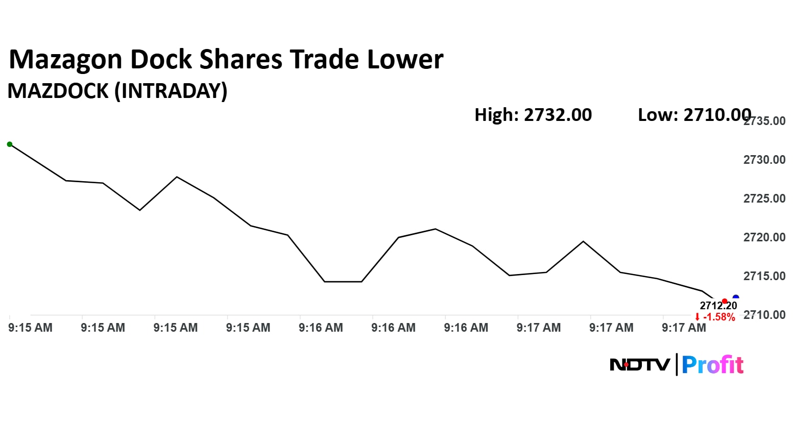 Shares of Mazagon Dock Shipbuilders fell as much as 1.66% to Rs 2,710 apiece. They pared losses to trade 1.58% lower at Rs 2,712.20 apiece, as of 9:18 a.m. This compares to a 0.46% decline in the NSE Nifty 50.