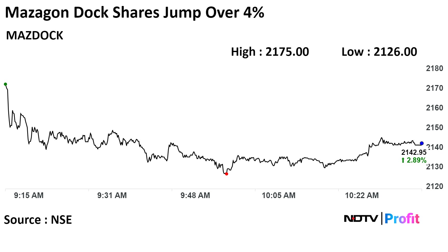 On the NSE, Mazagon's stock rose as much as 4.43% during the day to Rs 2,175 apiece, the highest since Oct. 16. It pared gains to trade 2.9% higher at Rs 2,143.55 apiece compared to a flat Nifty 50 as of 10:58 a.m.