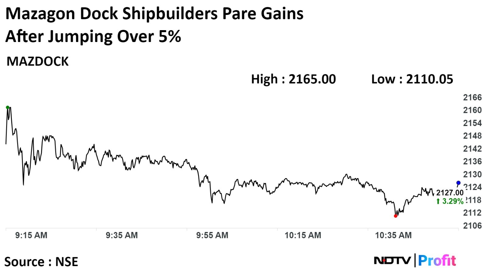 Shares of Mazagon Dock Shipbuilders rose as much as 5.22%, before paring gains to trade 3.17% higher at 10:48 a.m., compared to a 0.02% advance in the benchmark Nifty 50.