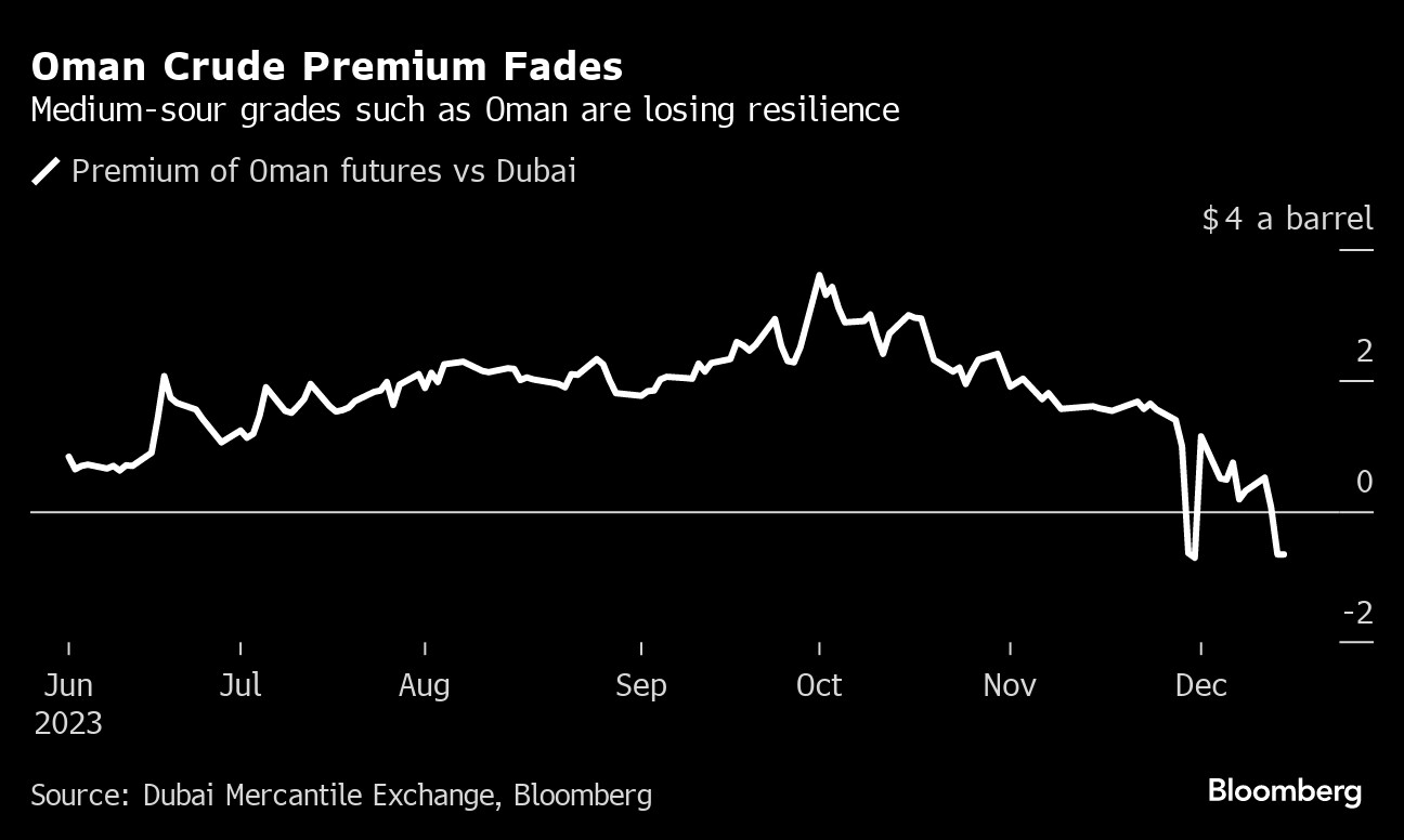 In Europe, demand for medium-sour varieties has continued to struggle after some weakness over the past month. Norway's Johan Sverdrup has been hovering at a discount of $2 a barrel to its regional benchmark versus a premium of around $2 in early November.