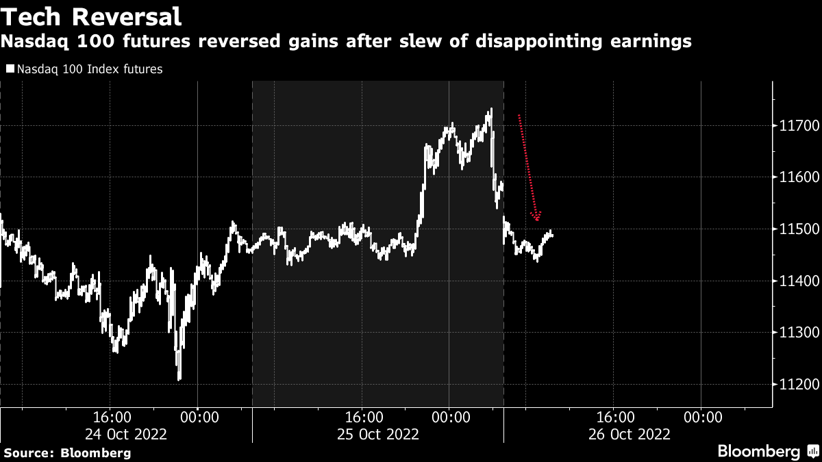 The quarterly updates from Microsoft Corp., Alphabet Inc. and Texas Instruments Inc. underscored growing pressure on everything from corporate IT budgets to digital ad spending and chips for industrial machinery. Nasdaq 100 Index futures lost as much as 2.4%, reversing an earlier rally on Tuesday, as the results refocused investor attention on the damage to earnings and the economy from the Federal Reserve's rapid interest-rate hikes.