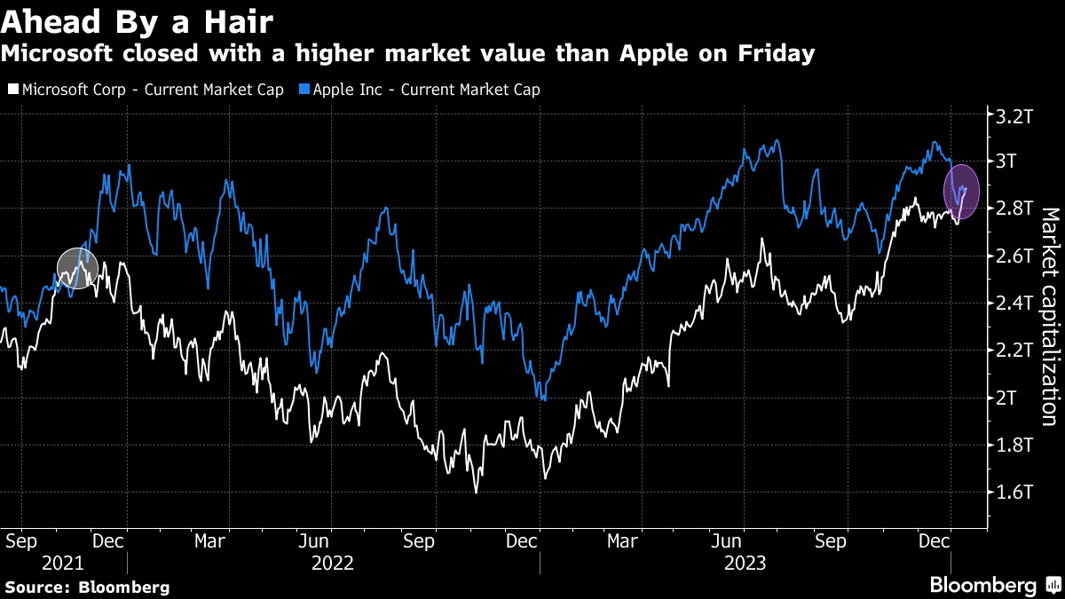 The Redmond, Washington-based software giant rose 1% to $388.47 on Friday, ending with a market valuation of $2.89 trillion. Meanwhile, Apple gained 0.2% and closed with a market capitalization of $2.87 trillion. It's the first time since November 2021 that Microsoft has closed with a higher value than Apple.