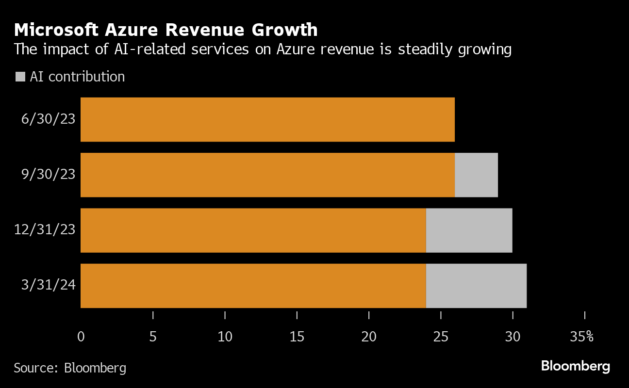 Azure revenue gained 31% in the quarter, above an average prediction of 29% and picking up slightly from the 30% growth in the previous period. About 7% of that increase was attributable to AI, compared with 6% in the prior quarter.