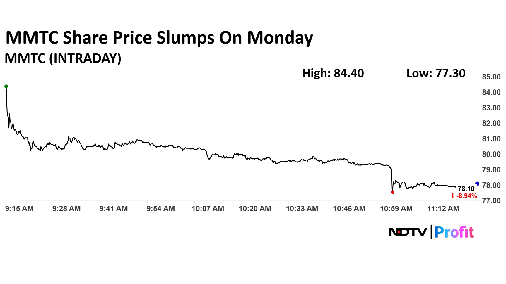 The share price of MMTC fell as much as 9.88% to Rs 77.30 apiece, the lowest level since May 29. It pared losses to trade 9.20% lower at Rs 77.88 apiece, as of 11:20 a.m. This compares to a 0.44 % decline in the NSE Nifty 50 Index.