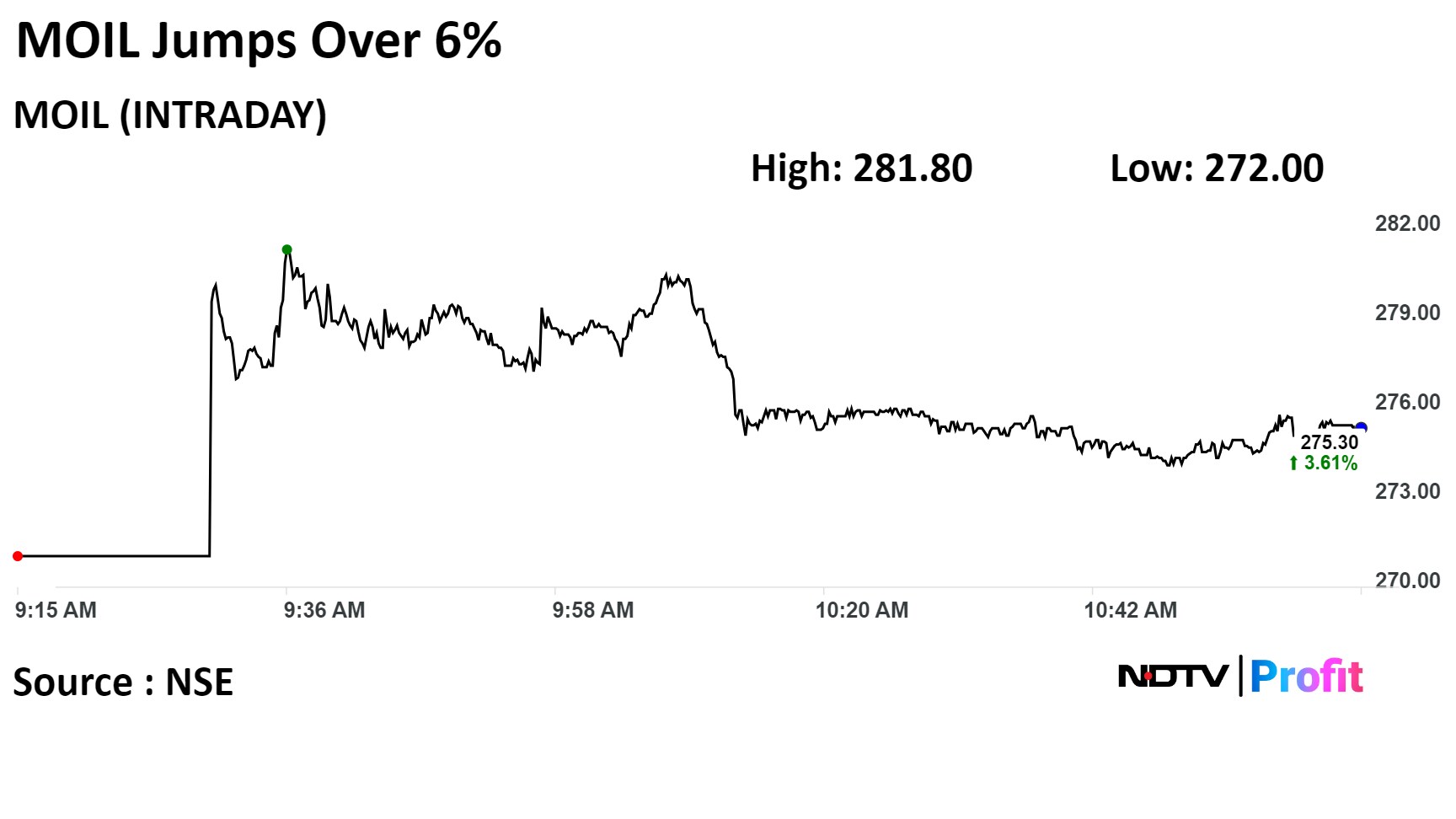 Shares of MOIL rose as much as 6.06% intraday, the highest jump since Jan. 29. It pared gains to trade 3.42% higher, compared to a 0.93% advance in the benchmark NSE Nifty 50 as of 11:05 a.m.