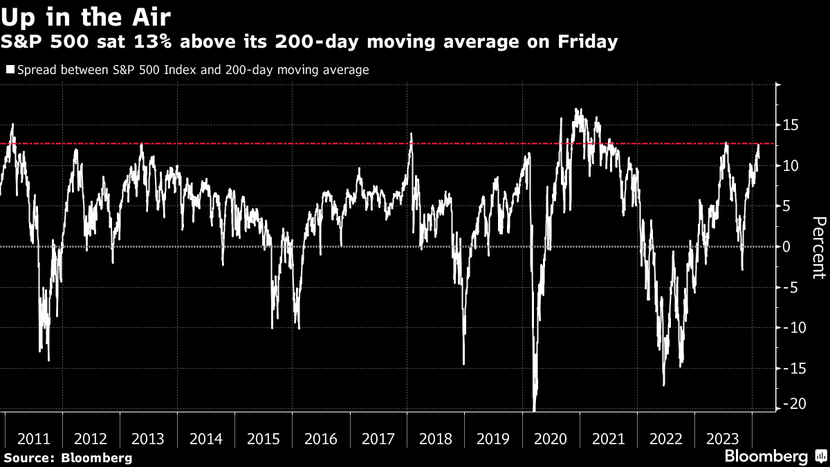 Signs of over exuberance are everywhere: The S&P 500s 15-week rally, in which it gained 22% through Monday's close, pushed the gauge 13% above its 200-day moving average, something that has occurred on just 5% of the trading days this century. Hedge funds' exposure to money-losing tech firms is hovering near a two-year high. And across the stock market, positioning is stretched and demand for loss protection muted.