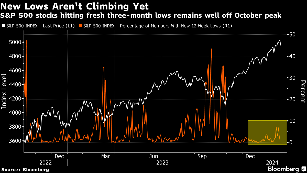 Another issue for bulls is that that fewer stocks have been participating in the rally this year, which could worsen the pain as indexes decline. Some 51% of stocks in the S&P 500 Index are trading above their 50-day moving average, the fewest since November.