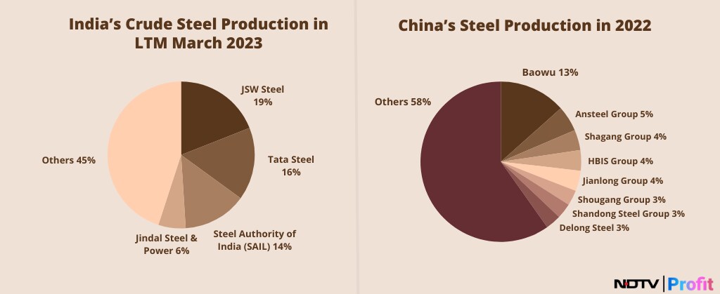In 2022, China's ten largest steel producers contributed 44% of the nation's steel output, whereas India's five largest producers accounted for around 60% of the country's total steel production in the last 12 months ending March 2023, Moody's said.
