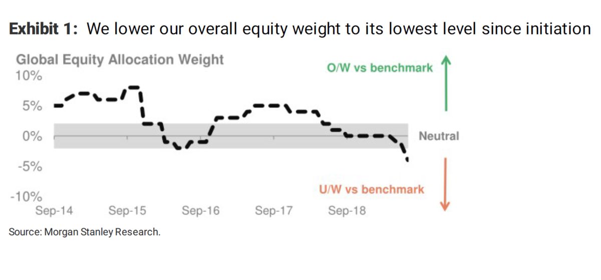 Morgan Stanley reduced the global equity allocation to lowest in five years and downgraded its stance to ‘Underweight', citing poor outlook on stocks over the next three months.