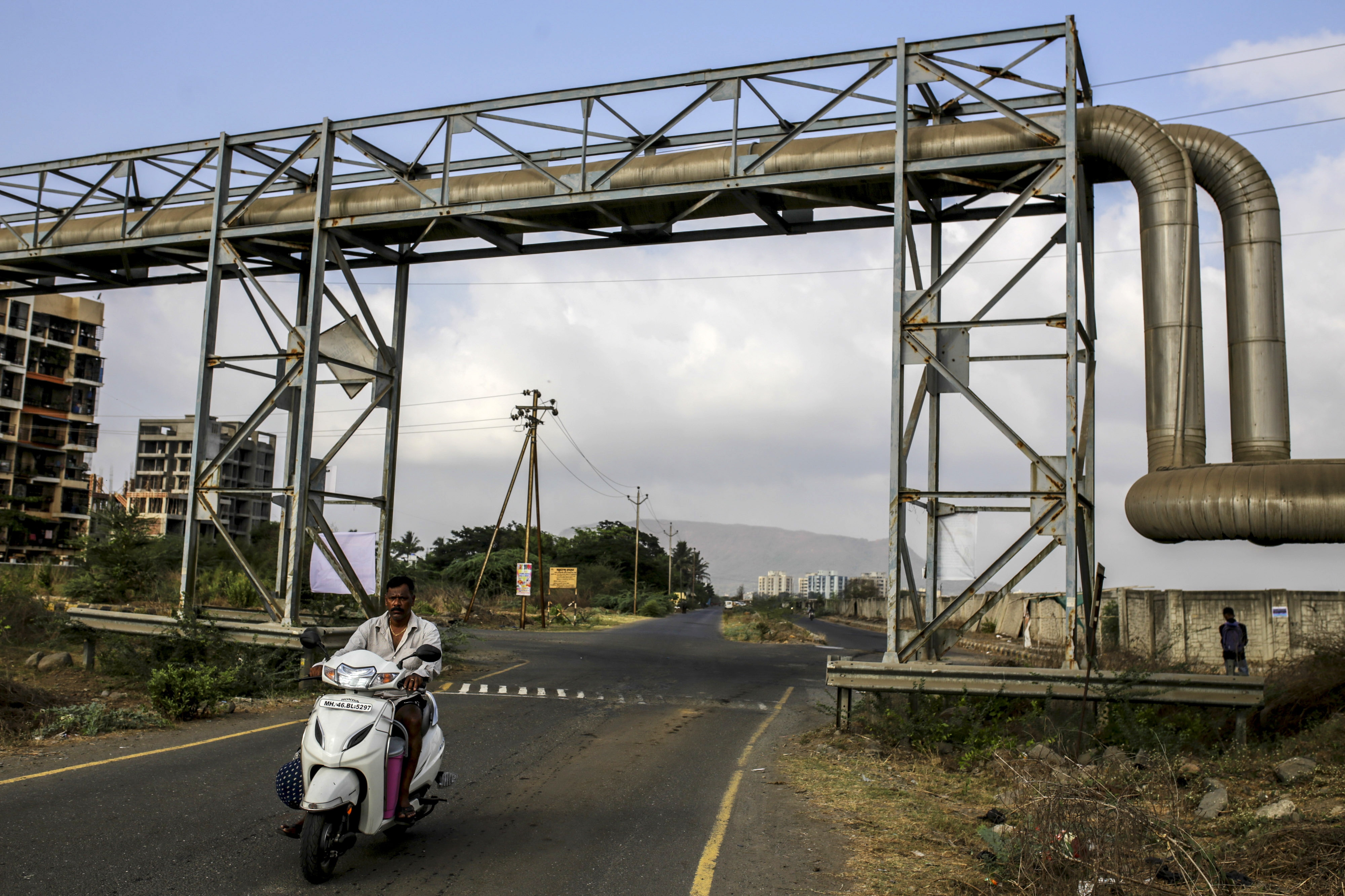A gas pipeline at Jawaharlal Nehru Port in Navi Mumbai. Volume of Indraprastha Gas grew at its slowest pace in five quarters while that of Mahanagar Gas fell to its lowest in eight quarters. (Photographer: Dhiraj Singh/Bloomberg)
