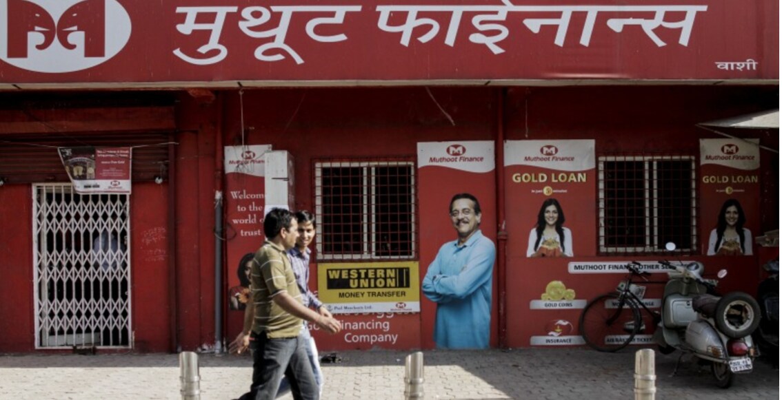 Pedestrians walk past a Muthoot Finance Ltd. branch in Mumbai, India.(Photographer Dhiraj Singh/Bloomberg)