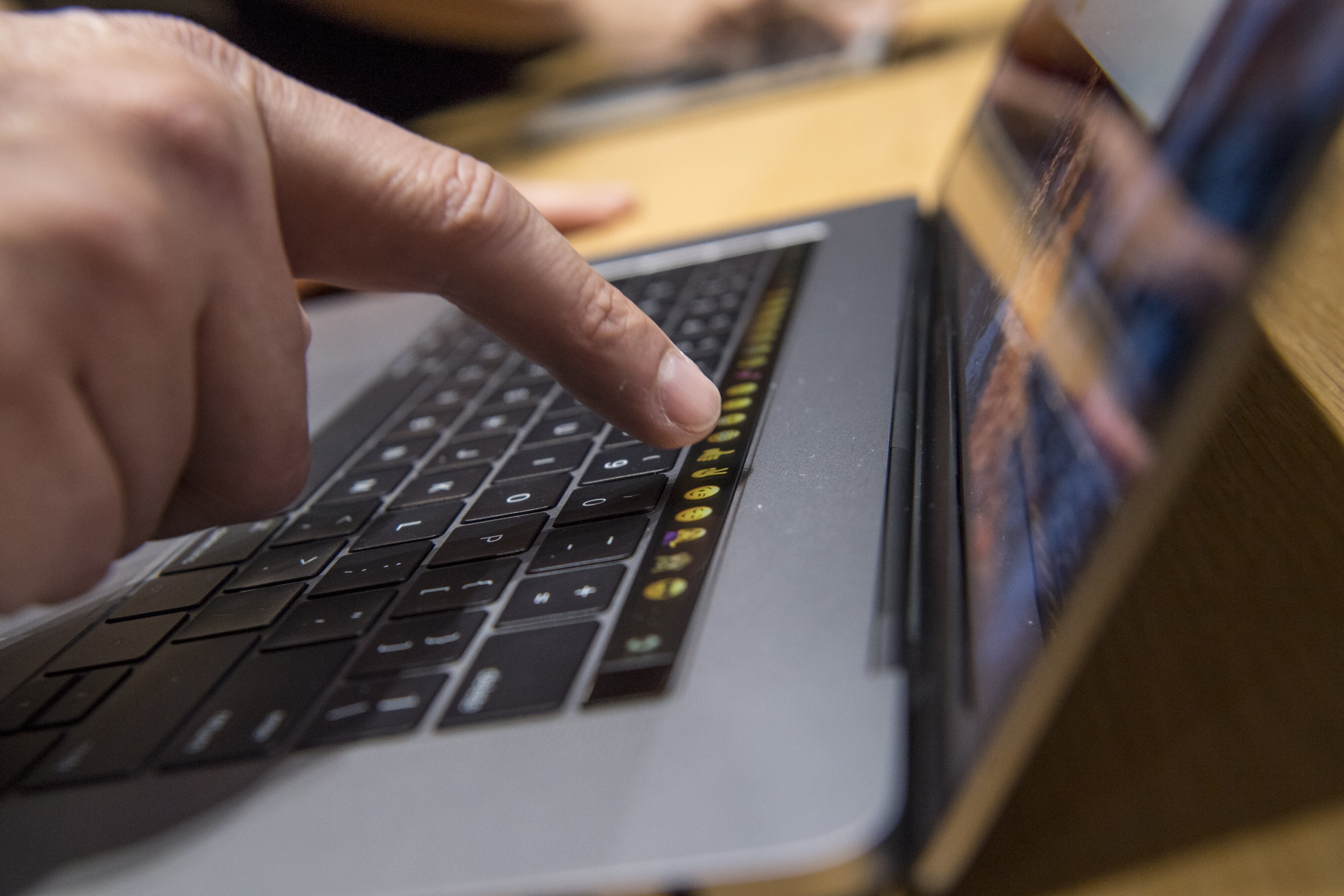 An attendee demonstrates the Touch Bar on a new MacBook Pro laptop computer. (Photographer: David Paul Morris/Bloomberg)